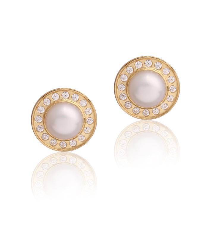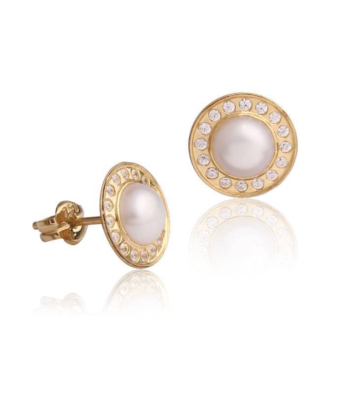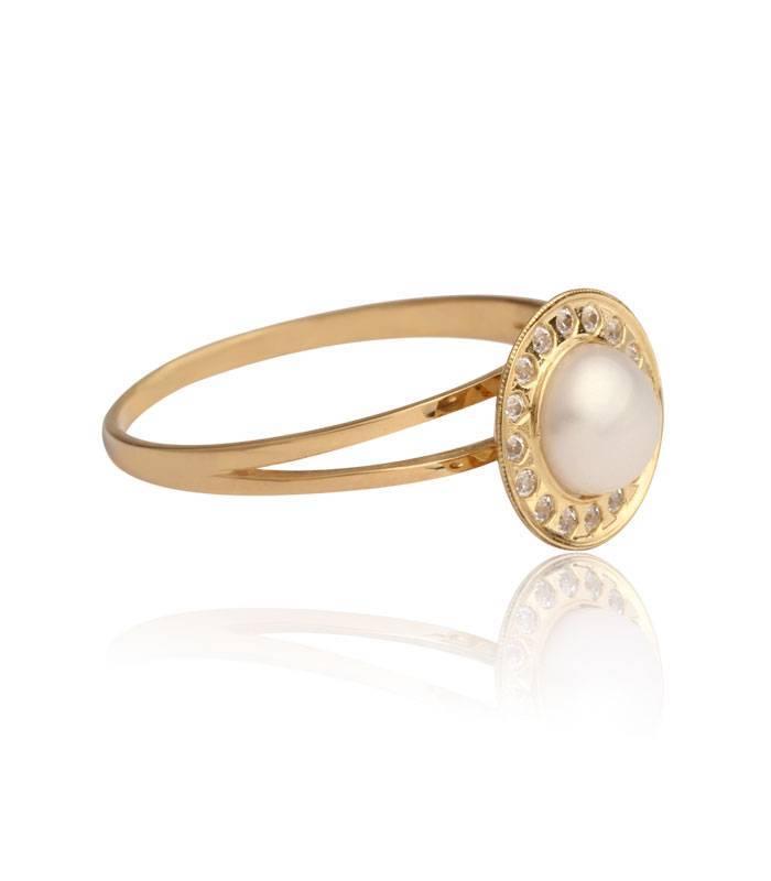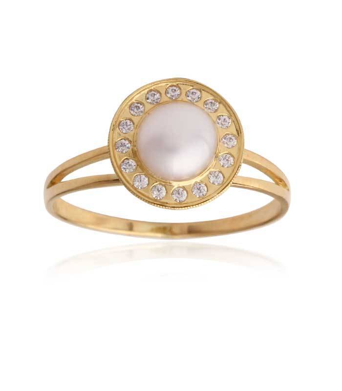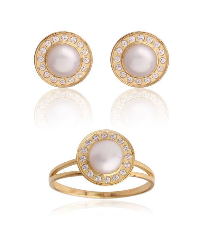 Conjunto "Petty" en oro de 18 quilates. Pendientes con hilera de circonitas talla brillante rodeando una perla cultivada en el centro. Acabado pulido y cierre de presión. Anillo con detalle central de 9mm de diámetro.
